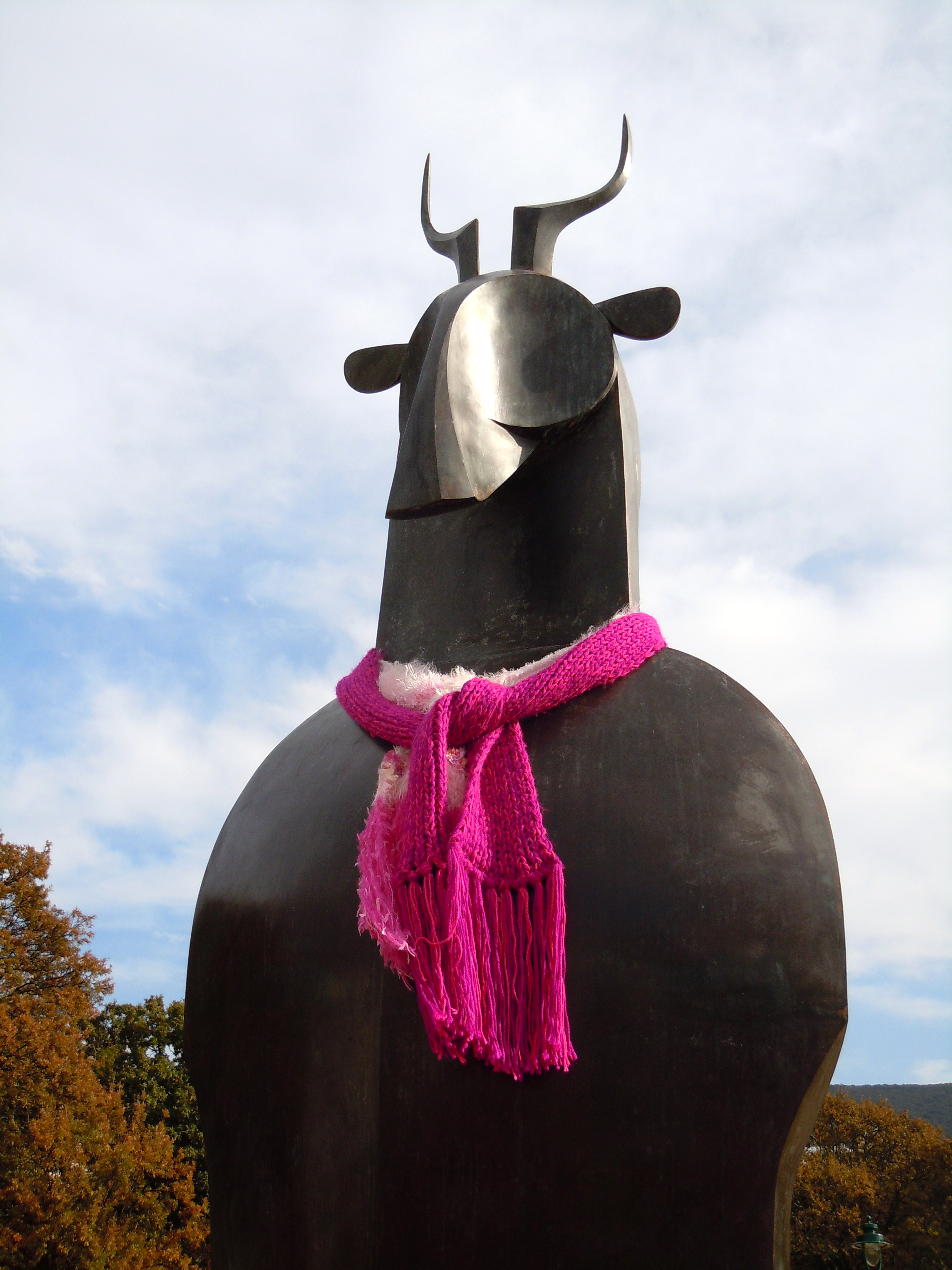 But on our way into the Gallery, we came across Cape Town’s first experiment in yarn bombing. This is a form of graffiti or street art where knitting and other needlework is used to decorate public spaces. Statues get scarves; railings are covered in woolly tubes; and trees are festooned with crafty baubles.