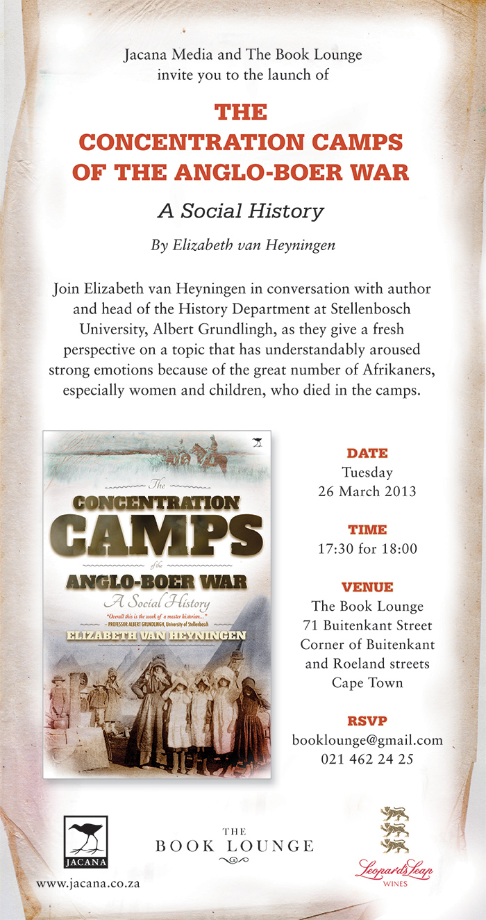 Earlier this year I went to the launch of Elizabeth van Heyningen’s The Concentration Camps of the Anglo-Boer War: A Social History at the Book Lounge in central Cape Town. The result of years of hard work in archives scattered around South Africa and Europe, this book has become – and will remain for some time – the standard history of the camps established for Boer and black civilians during the South African War (1899-1902).